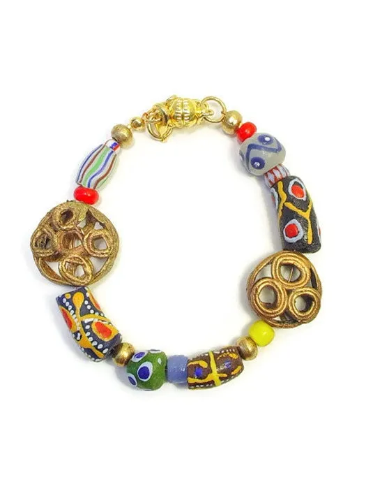 French Wire Dangle Earrings with Ghana Krobo Glass Beads and Brass Openwork Disk Beads